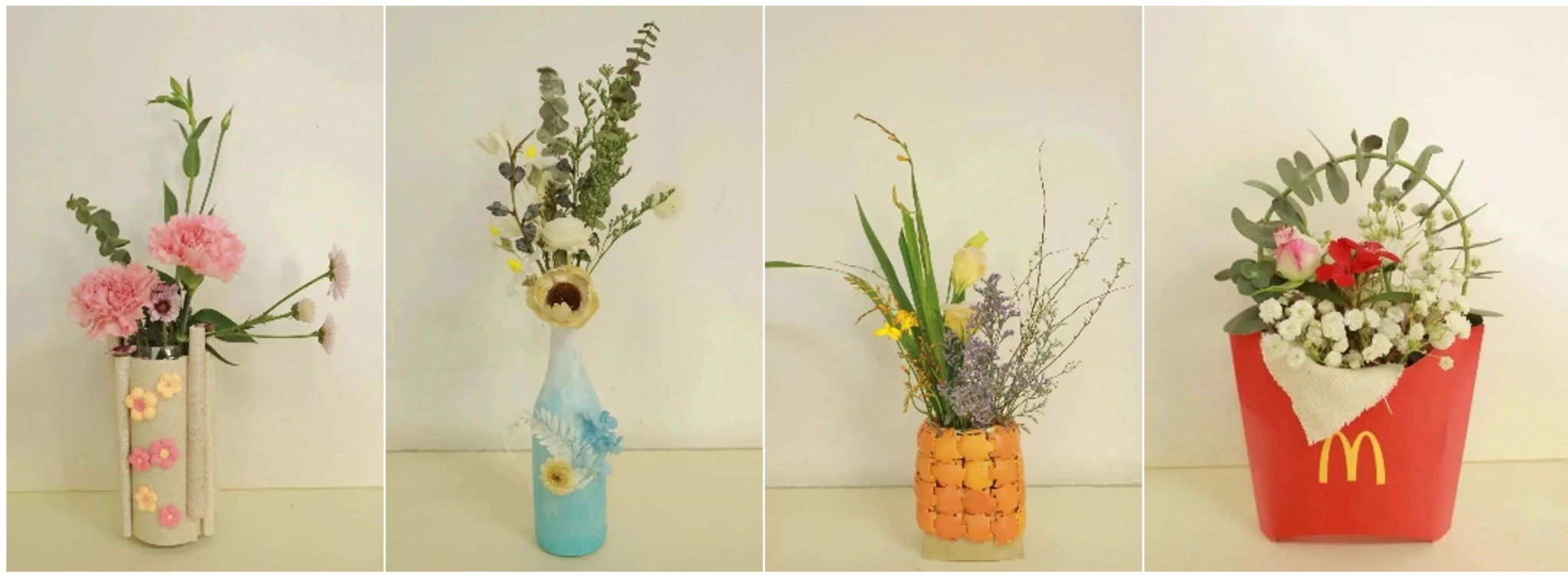 作品內(nèi)容:利用廢塑料瓶、塑料袋等廢棄物原材料,結(jié)合花、黏土等裝飾品,使用剪刀、熱熔膠槍等器材,將廢棄物進(jìn)行設(shè)計(jì)與加工,做成精美的手工藝品。
