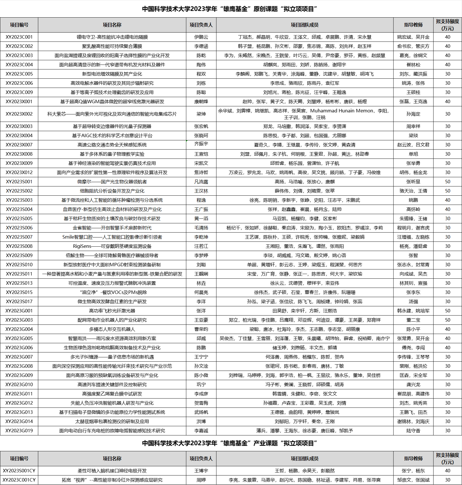 中國科學技術大學2023學年“雄鷹基金”擬立項項目
