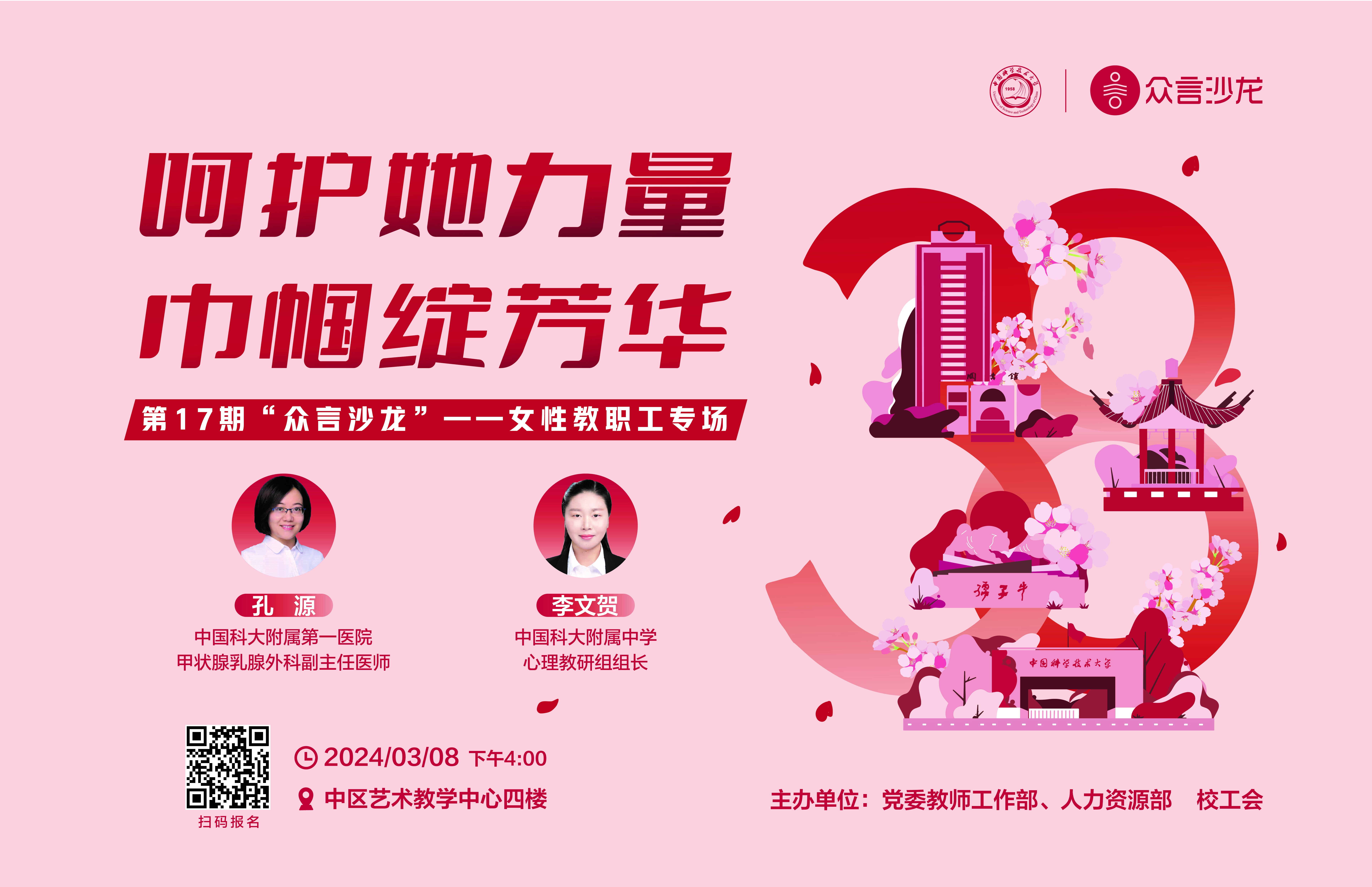 活動定于3月8日(周五)下午4:00在中區藝術教學中心開展,請掃描海報中的二維碼或直接點擊鏈接進行報名:https://www.wjx.cn/vm/eGx81B4.aspx#,報名截止時間:3月6日(周三)下班前。誠摯歡迎感興趣的女性教職工報名參加!報名通過者將另行發送通知,名額有限,欲報從速。