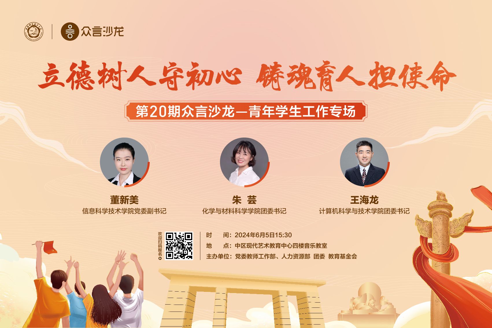 立德樹人守初心,鑄魂育人擔使命。第20期“眾言沙龍”活動將舉辦青年學生工作專場,邀請信息科學技術學院董新美老師、化學與材料科學學院朱蕓老師、計算機科學與技術學院王海龍老師與大家面對面交流。