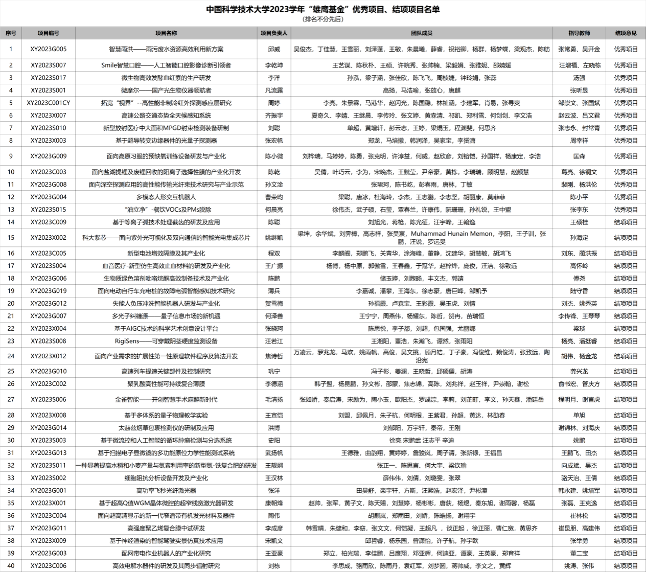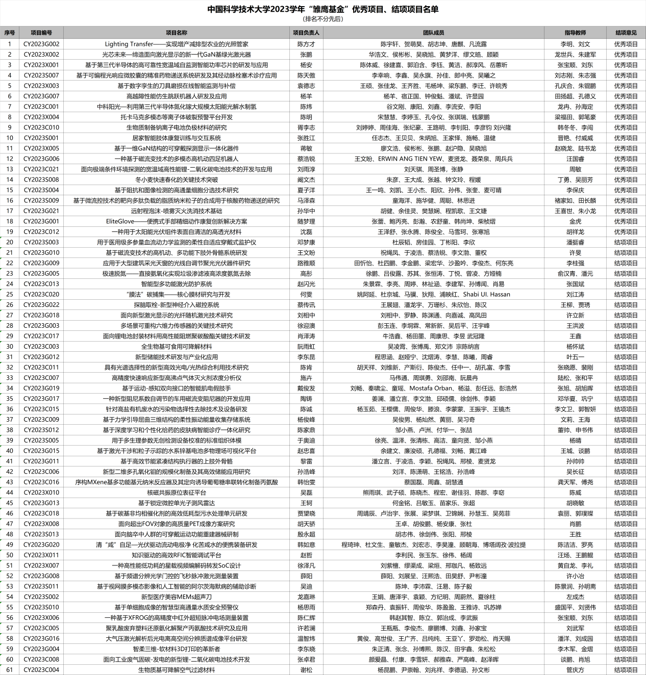 根據(jù)工作安排,中國科學(xué)技術(shù)大學(xué)2023學(xué)年“雛鷹基金”、“雄鷹基金”立項(xiàng)項(xiàng)目經(jīng)過項(xiàng)目總結(jié)、成果復(fù)核、專家評(píng)審等環(huán)節(jié),確定“用于醫(yī)用級(jí)多參量血流動(dòng)力學(xué)監(jiān)測(cè)的柔性自適應(yīng)穿戴式監(jiān)護(hù)儀”等61個(gè)項(xiàng)目作為2023學(xué)年“雛鷹基金”結(jié)項(xiàng)項(xiàng)目,其中,“Lighting Transfer——實(shí)現(xiàn)增產(chǎn)減排型農(nóng)業(yè)的光照管家” 等19個(gè)項(xiàng)目(詳見附件1)被評(píng)為2023學(xué)年“雛鷹基金”優(yōu)秀項(xiàng)目;確定“基于等離子弧技術(shù)處理截齒的研發(fā)及應(yīng)用”等40個(gè)項(xiàng)目作為2023學(xué)年“雄鷹基金”結(jié)項(xiàng)項(xiàng)目,其中,“智慧雨洪——雨污廢水資源高效利用新方案”等13個(gè)項(xiàng)目(詳見附件2)被評(píng)為2023學(xué)年“雄鷹基金”優(yōu)秀項(xiàng)目,特此通知。