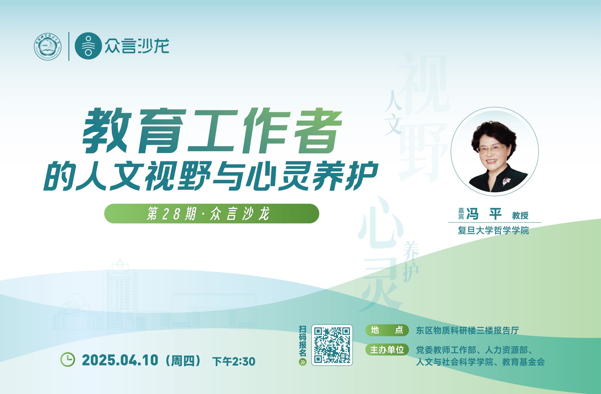 為提升教師業務能力和綜合素質,加強對教師隊伍的關心關愛,第28期“眾言沙龍”將以“教育工作者的人文視野與心靈養護”為主題,邀請復旦大學哲學學院馮平教授作為嘉賓,與大家面對面交流。