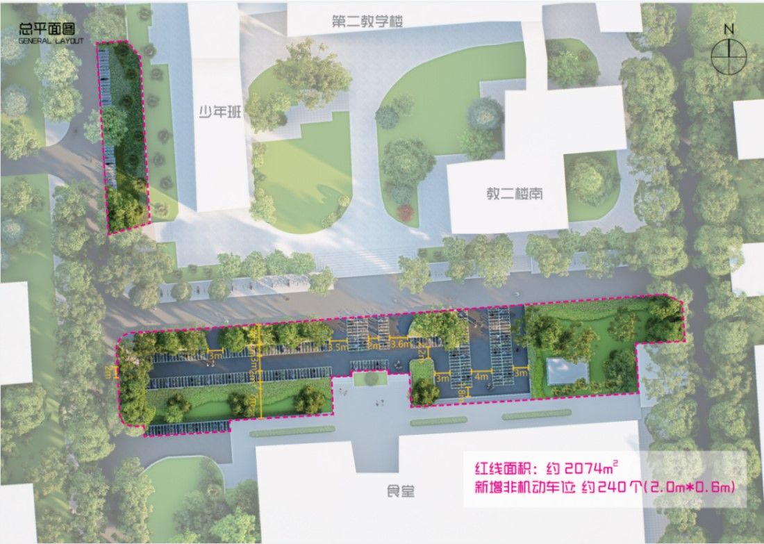 將東校區學生食堂北側綠地局部改造為非機動車停車位,增加非機動車停車數量。