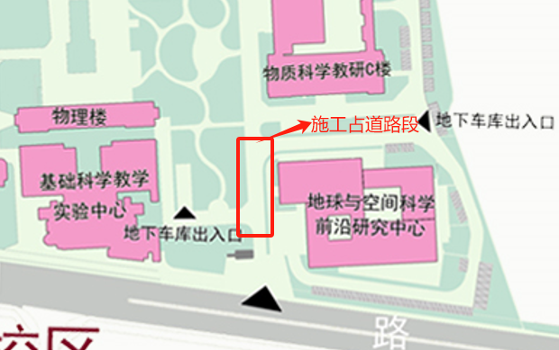 施工車輛占道期間地球和空間科學前沿研究中心西側道路(詳見附圖)車輛將無法通行,因此東區太湖路東南門在此期間僅供非機動車輛及行人通行,給師生員工帶來不便,敬請諒解。